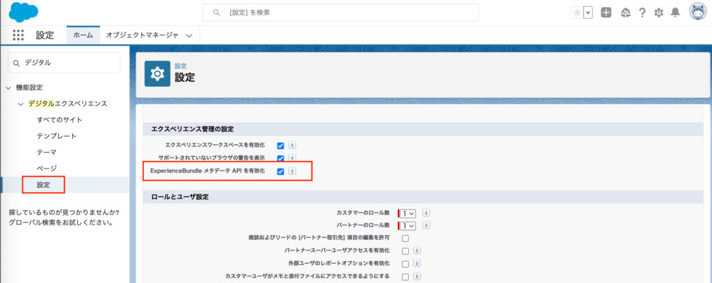 利用するには、「ExperienceBundle メタデータ API を有効化」設定をONにする必要があります。