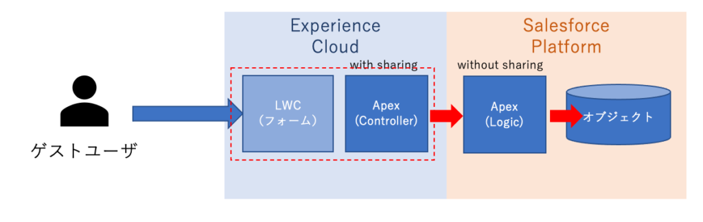 Controller は with sharing で実装し、実際にオブジェクトへアクセスするクラスを without sharing で実装します。このクラスを Controller から呼び出すことで、オブジェクト権限をゲストユーザに付与する必要がなくなります。